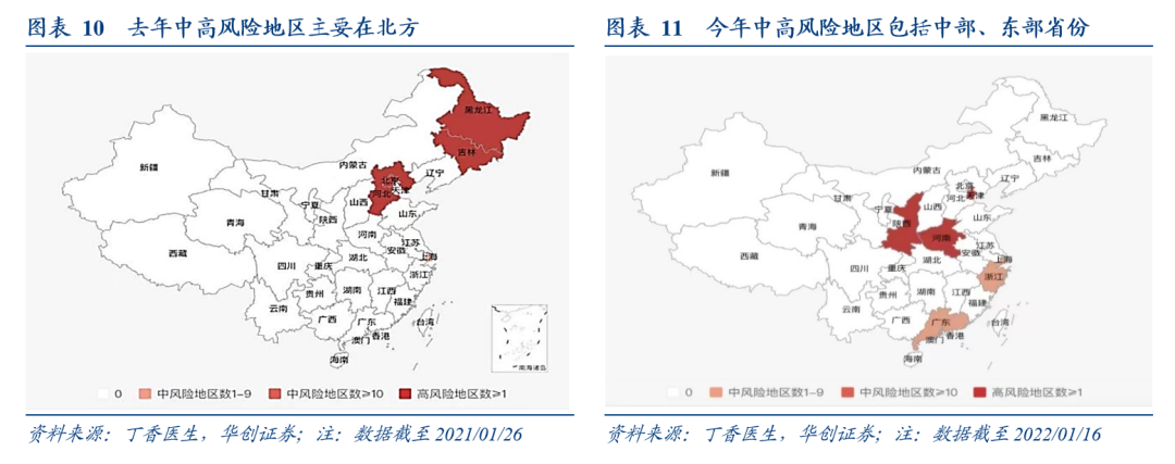 第一:疫情的影响。今年的疫情的情况比去年同期更加严重。体现在新增确诊人数更多,涉及省份更多,疫情严重的省份经济体量更大三个层面上。在春节前16-50天的时间段内,去年全国本土新增确诊人数合计为1909人,涉及10个省市,单日新增确诊病例的峰值为135人(节前28天);今年全国本土新增确诊人数合计达到3579人,涉及17个省市,单日新增确诊病例的峰值为182人(节前35天)。疫情较为严重的天津、陕西、浙江、河南四省市GDP合计达16万亿。而去年同期疫情较为严重的河北、吉林、黑龙江、辽宁四省市GDP合计10万亿左右。