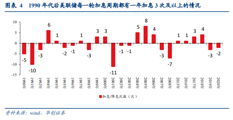 1990年代后美联储每一轮加息周期都有一年加息3次及以上的情况。90年代以来的加息周期中,全年加息次数少于3次的仅1995年、1997年、与2015-2016年。由次可见,如果2022年美联储选择加息3次及以上,那么其实符合美联储历史上一贯的操作习惯。
