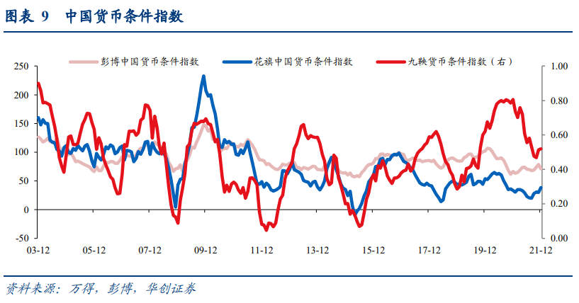 一是九鞅货币条件指数。九鞅货币条件指数由M2、社会融资规模、外汇占款等构成,主要用于衡量实体经济的融资条件。该指数的编制方法:计算底层指标在过去一段时间内的相对值,根据权重加总,得到加权指数值,并通过平滑得到最后的指数;指数采用0—1指数制度,1为货币条件最宽松,0为货币条件最紧缩(设定周期内相对松紧)。二是彭博中国货币条件指数。彭博中国货币条件指数旨在提供追踪中国货币政策的单一指数,其中实际利率和总贷款增长率衡量了货币政策现状对总需求的影响,而实际有效汇率则衡量了货币政策对国外总需求的影响。指数权重中,60%为实际利率,15%为实际有效汇率,25%为贷款增长率。与前一周期相比,更高/低的值反映了更宽松/紧缩的货币条件。三是花旗中国货币条件指数。花旗中国货币条件指数使用实际加权平均贷款利率、M2增速以及实际人民币有效汇率等三个指标,然后将SVAR模型的累积脉冲响应函数得出的回归系数作为三个指标的权重。此外,花旗中国货币条件指数将2007年作为中国货币政策相对平衡的基准,而指数的下降/上升则意味着货币条件的紧缩/宽松。![]()