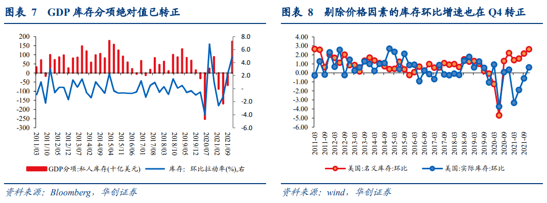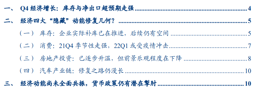 私人投资:库存增长大超预期,贡献Q4 GDP增速的约70%。私人投资分项对GDP环比拉动率为+5.2%,较前值(2.1%)提升3.1个百分点。私人库存是主要拉动项,对GDP环比拉动率为+4.9%,较前值提升2.7个百分点,贡献GDP增速的71%。另外,Q4固定投资也有所回升,对GDP环比拉动率为+0.25%,较前值(-0.2%)提升0.45个百分点,除建筑投资外,多数固定投资出现改善,特别是住宅投资回升趋势较为明显。私人消费:耐用品再度改善,疫情对出行相关消费的冲击有所显露。私人消费分项对GDP环比拉动率为2.25%,较前值(+1.4%)提升0.85个百分点。其中耐用品消费Q4显著改善,对GDP环比拉动率由负转正,达到0.14%,前值-2.5%,不过Q4疫情再度冲击下,服装鞋袜等与出行相关的非耐用品消费、食宿服务等服务消费增长出现回落,带来非耐用品、服务消费对GDP环比拉动率分别下降至-0.02%/+2.1%,较前值回落0.3/1.5个百分点。净出口:Q4出口大增而进口减弱,净出口对经济的贡献超预期走强。Q4出口与进口对GDP环比拉动率分别为+2.4%/-2.4%,前值为-0.6%/-0.7%,出口大增而进口减弱。进出口结构中,商品出口与进口对GDP环比拉动率分别+1.7%/-2.1%,前值-0.4%/0%,或反映美国国内产出缺口有所收窄。政府支出:地方政府教育支出大幅回落,政府支出进一步回落。综合来看,目前“隐藏”动能修复进展以及未来进一步形成对经济拉动的顺序为库存、消费>地产>汽车产业链。库存:企业实际补库已在推进,后续仍有空间。四季度随着白宫推出大量改善运输问题的措施,零售商库存大增,剔除价格因素的库存环比增速已转正。同时,以实际库存的同比增速来观察库存周期,截至2021年11月企业库存同比增速(MA3)为-1.1%,仍未转正,预计企业仍有补库需求。消费:21Q4季节性走强,22Q1或受疫情冲击。考虑到居民资产负债表健康、消费信贷持续走高,超额储蓄对消费支撑的逻辑仍未被证伪。不过2022Q1消费大概率受Omicron冲击而显著下滑。房地产投资:已逐步升温,但前景乐观程度在下降。Q4以来新屋开工数量有明显提升,住宅投资对GDP的负向拉动显著收窄。但从我们观测美国地产景气度的“买、建、库、融”四维度来看,目前地产景气度最高的时点已然过去,后续地产投资景气度或有所下降。汽车产业链:修复之路仍漫长。Q4汽车消费、固定投资对GDP环比增速的拉动分别为-0.2%/-0.4%,对经济贡献仍为负。而商务部最新对芯片的研究显示短期内汽车产业链问题仍难以缓解,汽车行业的潜在动能何时释放仍需等待。3、经济“隐藏”动能尚未全面共振,货币政策仍有潜在掣肘在《美联储“大姿态”尽显,年内加息有何支撑与掣肘?——1月FOMC会议点评》中,我们复盘了掣肘美联储年内加息3次以上的因素,其中如果通胀能够如期回落,则内部经济增长偏弱或是主要掣肘因素。目前经济四大“隐藏”动能中库存、消费仍有改善空间,地产或走弱,汽车产业链前景未明,潜在动能尚未见全面共振。若Q1通胀如期回落,不明朗的经济基本面对美联储政策加速收紧仍有掣肘,后续市场重心或逐渐回归对经济前景的担忧。