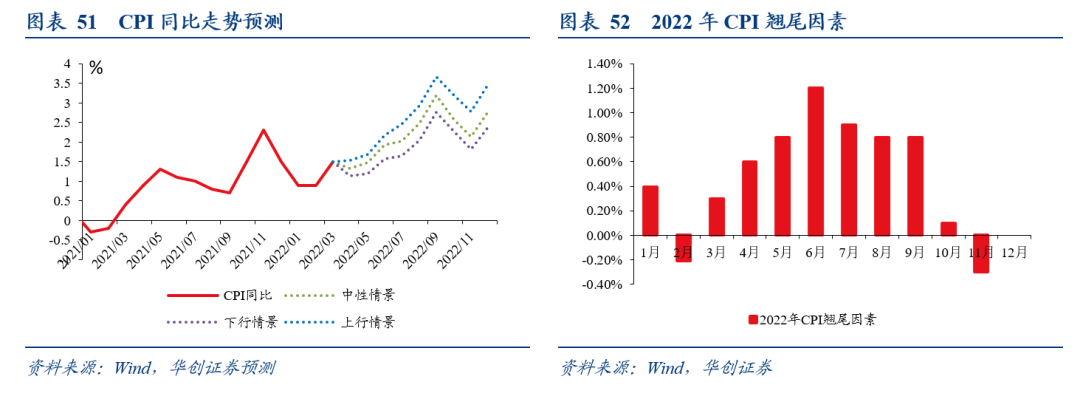 2)CPI展望:根据我们的“食品、能源和核心CPI”三分法来预测今年后期的CPI同比走势。我们预测的基准情景是,后续CPI同比将倾向于上行,在9月低基数效应下,CPI同比可能破3%;全年CPI同比均值约1.9%,整体维持在温和区间。在下行、上行情景下,预计今年CPI同比中枢分别约为1.6%、2.2%。
