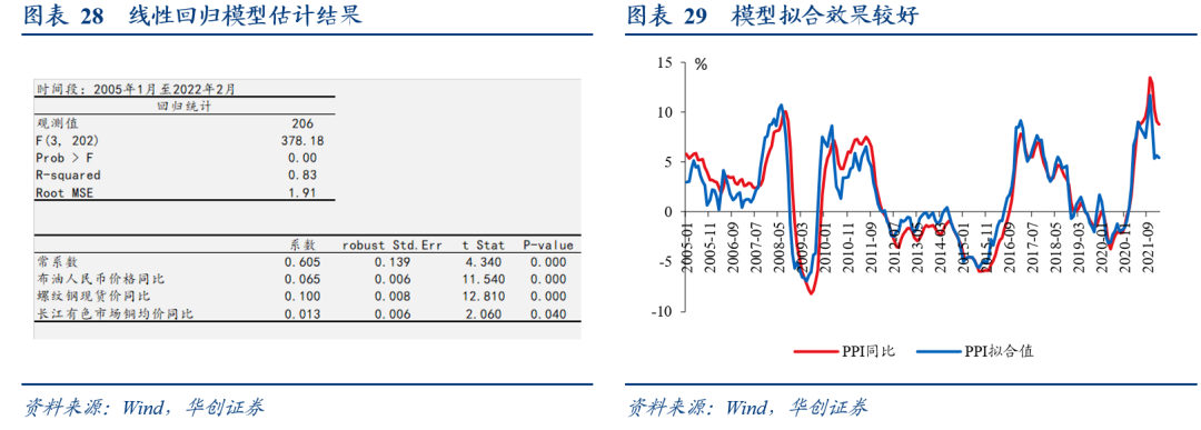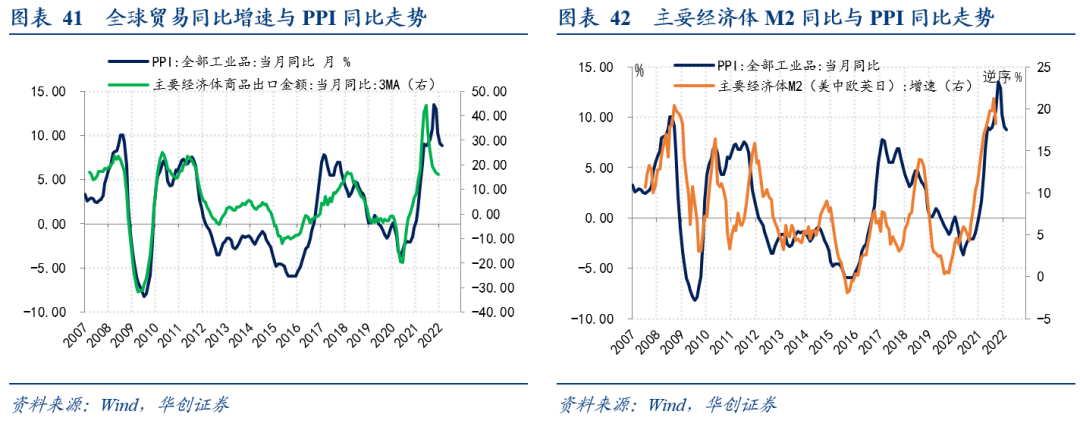 1)PPI同比走势:作为可贸易品,工业品的价格受全球经济和货币环境影响较为明显。以全球主要经济体出口额同比和主要经济体M2同比表征全球经济和货币环境情况,2010年下半年至2011年上半年PPI同比的回升,伴随着全球主要经济体出口额的高位回升、主要经济体M2同比的上行;这一轮,在全球央行货币政策宽松退潮、通胀高企、疫情和供应链影响下,全球贸易增速和主要经济体M2同比增速趋于回落,指引PPI同比趋势向下。