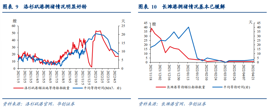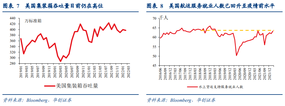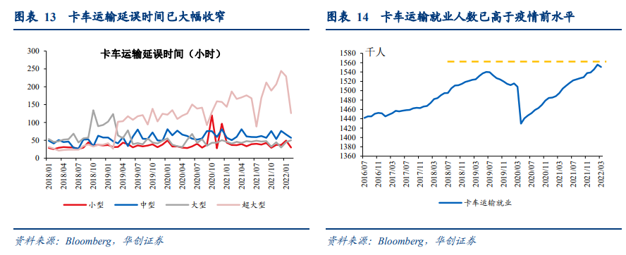 近期美国运输紧张问题已有明显改善。港口运输方面,需求端来说,美国集装箱吞吐量目前仍在高位;但供给端来说,美国航运服务就业人数已回升至疫情前水平,洛杉矶港、长滩港等美国主要港口的拥堵情况均有明显好转。陆路运输方面,需求端来说,公路运输市场需求较2021年已有回落,运输需求压力在缓解;供给端来说,可供应卡车数量较去年同期明显提升、卡车运输就业人数已高于疫情前水平、卡车运输延误时间也已大幅收窄。因此综合来看,港口与陆路运输供给紧张问题改善明显,对通胀的压力减弱。