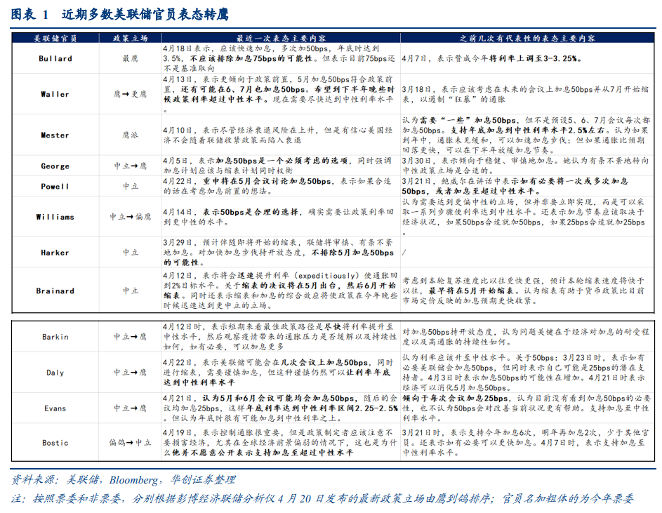 近期多数美联储官员表态转鹰,5月美联储加息50bp并讨论缩表或已箭在弦上。4月以来,多数前期立场中立(未明确表态支持加息50bp)的官员已明确表达支持5月加息50bp,并开始考虑加息前置的想法。