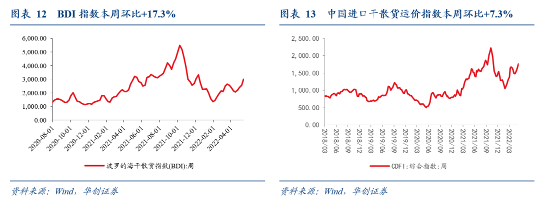 BDI指数本周环比+17.3%;CRB现货指数与工业原料指数本周环比-1.9%、-3.1%;中国进口干散货运价指数本周环比+7.3%;中国出口集装箱运价指数本周环比+1%,其中美东航线与欧洲航线运价指数分别环比+6.1%、+0.2%。