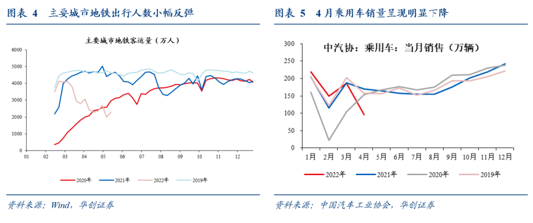 汽车:5月前一周,乘用车零售同比-21%,批发同比-17%。4月汽车产销呈现明显下降。据中汽协数据,4月产销量在120万辆左右,为近十年以来同期月度最低。乘用车销量方面,4月累计销售96.5万辆,环比下降48.2%,同比下降43.4%。1-4月累计销售650万辆,同比下降4.1%。