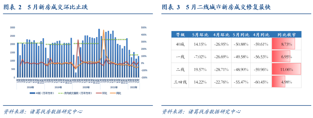 5月,二线城市是楼市“松绑”主力,杭州、南京、成都等核心城市也加入稳楼市行列。但本轮楼市放松,主要是对远城区和特定购房人群的定向松绑,对于降首付等刺激性更强的政策,出台城市不多。楼市新政密集出台,对整体成交确实有提振作用,5月40城新房成交面积环比上涨14.15%,止跌回升,其中二线城市修复最明显。由于各城市政策方向和力度不同,作用效果出现分化。