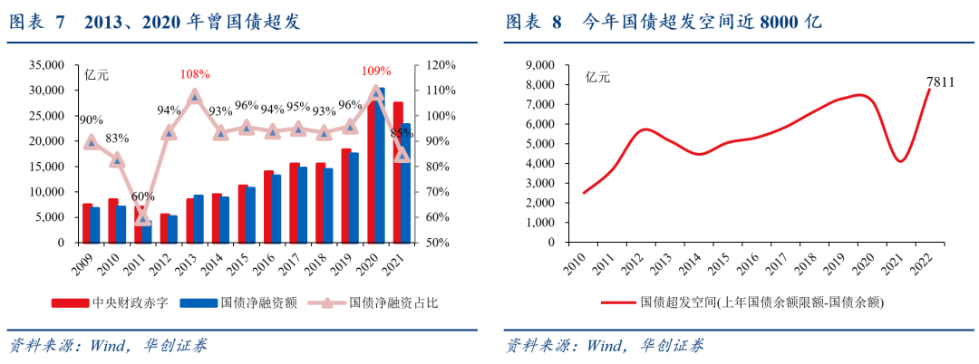 国债超发,指国债净融资超过两会确定的中央赤字规模,在2013年、2020年曾采用,分别超发666亿、2553亿;今年最高可超发7811亿,或用于增加对地方转移支付,对应今年4月12日国务院政策吹风会上,财政部国库司司长王小龙所说的“必要时将灵活运用短期国债工具进行筹资”。国债超发的依据,是我国自2006年起对国债实行余额管理,简单来说就是只要不超规定的年末限额,每年新增发行(对应余额上升)不受限制,中央赤字并非硬约束:立法机关不具体限定中央政府当年国债发行额度,而是通过限定年末国债余额上限来限制国债规模,这一上限每年可向上提升,幅度即为当年全国人代会批准的中央赤字规模,因此,一旦过往年份国债少发(净融资少于当年中央赤字),就会积攒未来超发的空间;由于2009年以来国债除2013、2020年外均为少发,今年已积攒了近8000亿超发空间。程序上,只要年末余额不超限额(超发7811亿以内),均无需过人大,国务院同意即可。![]()