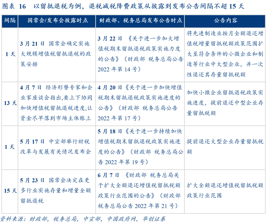 收入工具主要是退税减税降费,按其目的可分为促消费、扩投资、稳外贸、保主体4类。两会确定预算后,主要就是对政策的加码和细化。历次应对危机的减税降费,主要有3次可供年内参考(图15):1998~2002年应对亚洲金融危机,主要偏扩投资、稳外贸,同时帮扶国企下岗职工;2008~2012年应对次贷危机,采用较为均衡的结构性减税;2020年应对疫情冲击,大规模减税降费以保主体为主,降费是大头(为市场主体减负超2.6万亿,其中减免社保费1.7万亿)。2022年在疫情反复下稳增长,主要通过留抵退税扩投资、保主体(预计全年新增退税超1.64万亿,减税1万亿,社保缓缴0.32万亿)。从年内空间看,总量空间已有限,稳外贸及降费政策仍可期待。考虑到今年退税减税降费占比财政收入、GDP均已基本持平2020年,预计后续以结构性发力为主,对比历次危机,今年在稳外贸上仍有进一步发力空间;降费相比2020年仍有空间,或视疫情响应。从政策流程看,出台快速灵活。国务院同意后,通常通过国常会、新闻发布会、座谈会等形式先行披露,随后财政部、税务总局及有关部委快速发布公告明确细节、转入执行;以留抵退税为例,4次发布公告时点和政策披露时点间隔不超过15天(图16)。![]()