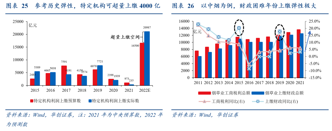 (二)从中央二、三本账调入:“财政后手”已补4000亿,可再补4000亿今年预算安排9900亿,但留了4000亿“财政后手”。主要是从中央二本账调入9000亿,资金来自央行、中投、中烟等特定机构的1.65万亿利润上缴,剩余900亿从中央三本账调入,资金来自实体央企常规利润上缴。1.65万亿利润上缴中,除了今年调入一般公共预算9000亿、二本账支出3500亿外,还留了4000亿“财政后手”,列入2023年预算。已补4000亿,就来自于预支“财政后手”:5月27日,财政部提前下达第三批4000亿预算支持减税降费和重点民生,使今年实际可支出资金较预算增加4000亿。可再补4000亿,来自于特定机构的超量上缴空间,两点理由:一是有空间,今年预算安排的1.65万亿利润上缴并未“掏空”特定机构,如财政部负责人 3 月 8 日披露“考虑当前与长远,在今年实施新的组合式税费支持政策的情况下,经按程序批准,今年安排特定国有金融机构和专营机构上缴了 2021 年以前形成的部分结存利润”。二是有先例,历史上财政困难年份出现过大幅超量上缴;特定机构的上缴主体和一般公共预算-非税收入-国有资本经营收入一致,都是央行+中投、中烟等财政“嫡系”,2015、2019两个财政困难年份,国有资本经营收入上缴分别达5389、7720亿,分别完成预算数的216%、127%,对应同期中烟上缴财政跳升(图26)。若今年特定机构上缴的预算完成度持平2019年,对应超量上缴将超4000亿。超量上缴在流程上是否有困难?法规无限制,财政部可“应收尽收”。对于央行,根据《中华人民共和国中国人民银行法》第三十九条“中国人民银行每一会计年度的收入减除该年度支出,并按照国务院财政部门核定的比例提取总准备金后的净利润,全部上缴中央财政”。对于财政“嫡系”,根据《中央国有资本经营预算管理暂行办法》第十六条“中央企业按规定应上交的国有资本收益,应当及时、足额上交中央财政。任何部门和单位不得擅自减免中央国有资本经营预算收入”;第三十条“本办法由财政部负责解释”。![]()