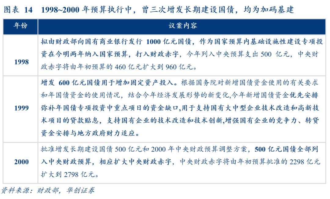 国债增发将直接增加赤字,且加码基建效果不如专项建设基金、专项债提前发行,理论上优先级最低,历史上出现过三次:分别为1998、1999、2000年增发1000亿、600亿、500亿(图14)。![]()