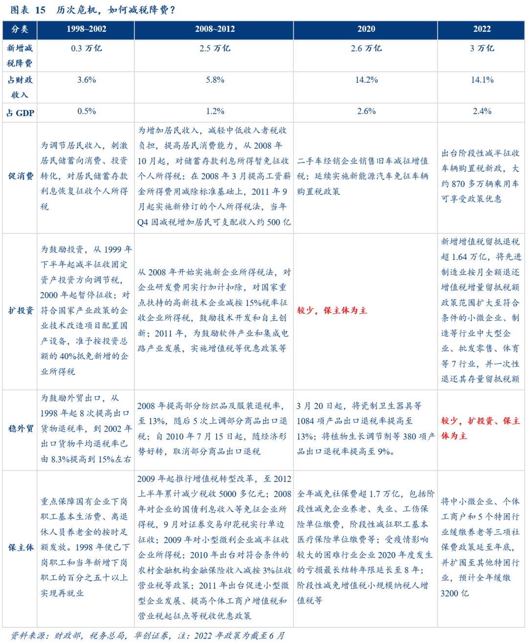 应对历次危机的减税降费,主要有3次可供年内参考:1998~2002年应对亚洲金融危机,主要偏扩投资、稳外贸,同时帮扶国企下岗职工;2008~2012年应对次贷危机,采用较为均衡的结构性减税;2020年应对疫情冲击,大规模减税降费以保主体为主,降费是大头。2022年在疫情反复下稳增长,主要通过留抵退税扩投资、保主体。