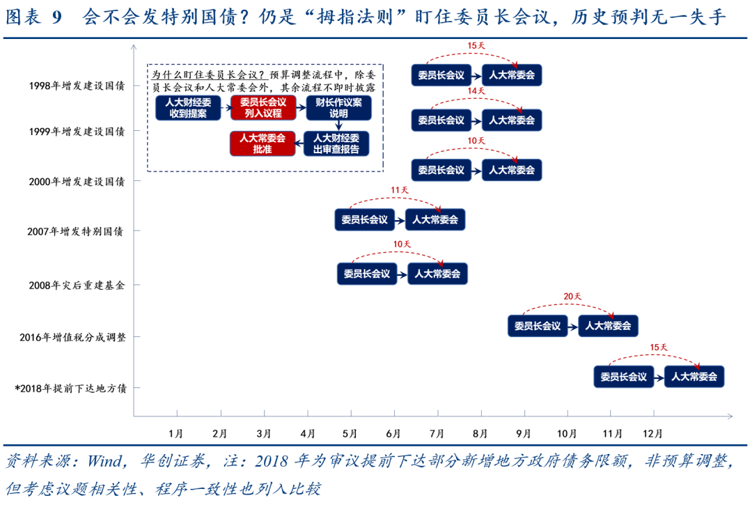 专项债提前发行无历史先例、也无明确法规限制,分两种情形讨论。情形1-需预算调整:专项债实行限额管理,简单来说就是不仅对年末余额有上限要求,每年新增限额也需人大及其常委会批准。因此两会定了当年新增专项债限额后,年中想多发专项债,都要走预算调整流程(图4)。对市场而言,一旦涉及预算调整,把握“拇指法则”——盯住委员长会议即可,因其是最早见诸报道时点,最近一次在7月底前后。预算调整方案需由人大常委会审批,人大常委会一般每两个月举行一次,通常在双月下旬,年内仍有8月、10月、12月3次会议时点;人大常委会日期、议程由委员长会议拟定,委员长会议一般在人大常委会前约10~20天举行,通过当天报道即可知10~20天后的人大常委会是否有相关议程,后续关注7月底、9月底、11月底前后的委员长会议拟定议程是否包含提前发行相关事项。情形2-无需预算调整,提前下达后即可发行,支持该情形的理由如下:首先,提前下达授权未提及提前发行,即没有明文限制,今年恰好为授权期限最后一年,提前下达专项债规模可达3.65*60%=2.19万亿。2018年12月,第十三届全国人民代表大会常务委员会第七次会议决定,“授权国务院在2019年以后年度,在当年新增地方政府债务限额的60%以内,提前下达下一年度新增地方政府债务限额(包括一般债务限额和专项债务限额)。授权期限为2019年1月1日至2022年12月31日。”其次,现行法规对提前发行无明确限制,因其限制对象为当年额度,而提前下达的是下年额度,或能绕开限制(图5)。综合两种情形看,对市场而言,更务实的是盯住两个时点:一是盯住7月底的委员长会议。若公布提前发行相关议程,则将走情形1中的预算调整流程,最早8月下旬人大常委会审批后各地可获提前下达额度,9月即可提前发行;二是盯住8、9月的潜在提前下达。2018~2020年都晚于11月提前下达,主要是当年额度到三季度末才基本发完,考虑到冬季施工条件,提前下达实际都指向下年启动发行;而今年发完时点较往年提前了一个季度,若提前下达时点也随之前移至8、9月(财政部开吹风会或地方财政接受采访披露),提前发行将具备往年未有的施工条件,概率大增。![]()