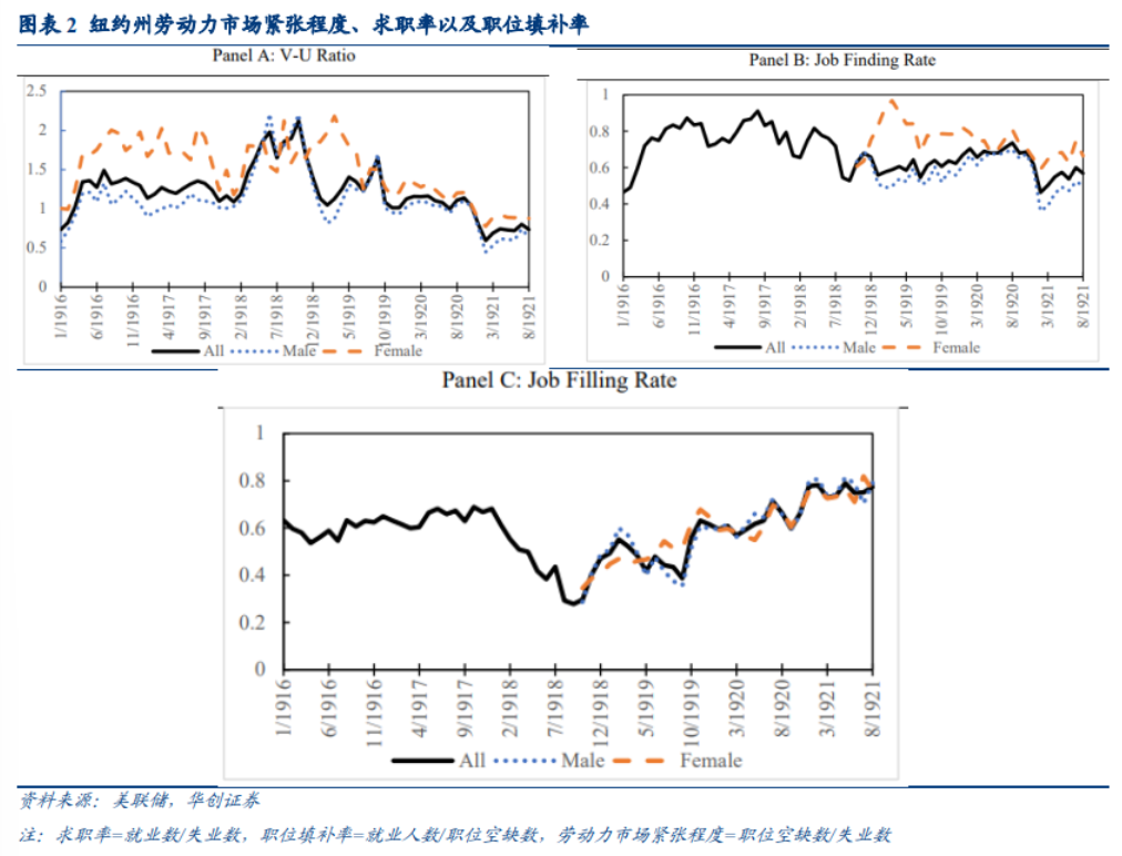 图表2展示了当时纽约州劳动力市场的情况。面板A显示的是1916年1月-1921年8月的职位空缺数/失业人数,表明劳动力市场在20世纪10年代非常紧张。在1918年三季度-1919年一季度的温和衰退期间,劳动力市场紧张程度有所下降,但随后迅速反弹。当美国经济在1920年1月达到顶峰时,劳动力市场吃紧。1920年中期,随着美联储提高贴现率,经济衰退加剧,劳动力市场紧张程度急剧下降。其中,女性就业市场比男性更为紧张。尽管如此,在经济衰退期间,对女性工人的需求仍然有所下降。值得注意的是,在此期间,劳动力市场的动态主要是由需求而非供应驱动。面板B和C则分别展示了当时的求职率和职位填补率变化。面板B显示,在1920年经济衰退加剧之前,求职率一直相对稳定。这是因为与职位空缺数相比,求职人数相对稳定。面板C则显示,1918年三季度后,职位填补率有所上升,此后随着经济达到顶峰,职位填补率下降。![]()