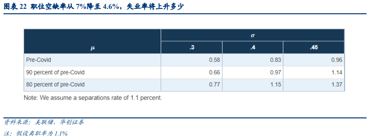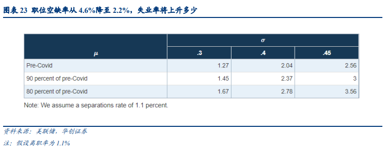 下表23则进一步展示了如果职位空缺率从4.6%下降2.4个百分点至2.2%(这是以往劳动力市场紧张时出现的更为典型的情况),失业率将出现什么变化。可以发现,在这一假设下估算的失业率增长幅度要比职位空缺率从7%降至4.6%的情况下大得多,前者约为后者的2-3倍。这说明了考虑劳动力市场当前状况的重要性。在当前如此紧张的劳动力市场中,相对于可用工人(求职者数量)而言,职位空缺率非常高,以至于职位空缺率的边际变化导致就业人数产生的变化幅度要比在更平衡的劳动力市场中小得多。因此,与更典型的劳动力市场情景相比,当前职位空缺率下降对就业的影响较小,对失业的影响也较小。简而言之,在匹配效率和重新分配效应不变的情况下,如果职位空缺率下降,预计失业率会上升,但上升幅度应明显小于劳动力市场处于贝弗里奇曲线更平坦部分时的幅度。![]()