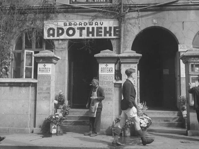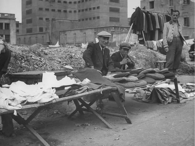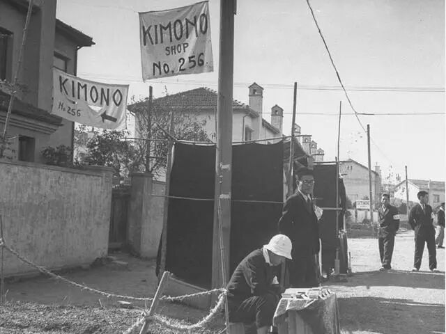 1945年12月,中国抗战刚刚胜利之后,满目疮痍,上海人急迫想过和平生活的渴求。1945年的上海刚刚脱离二战的阴影,这个被战争摧残满目疮痍的国际化大都市正在慢慢苏醒。图为一个女人在理发店前的街上卖盘子和其他家用器皿。