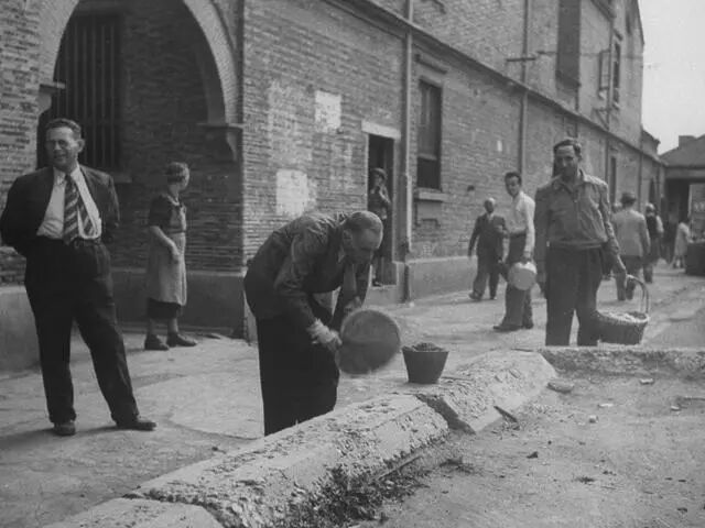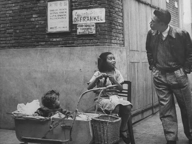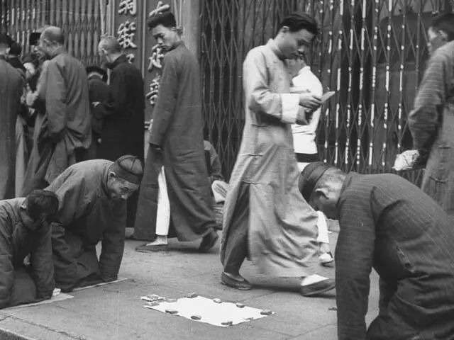 1945年12月,上海的乞丐把他们的乞求写在纸上铺本地面,自己跪本地上低头向来往的人鞠躬,人们从他们身边匆匆走过侧头看着这些人。