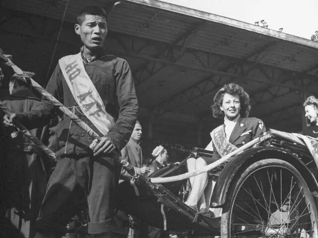 1945年12月,美国陆军军官在人力车里参加陆军和海军人员的比赛。