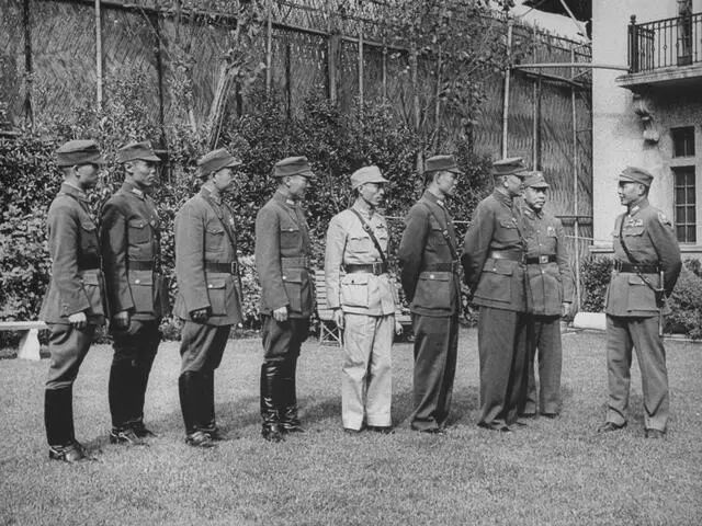 1945年12月,中国军队的司令官和他的工作人员在宽敞的花园里谈话。