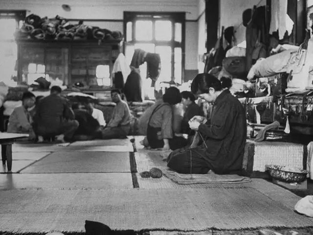 1945年12月,等待被遣返的日本难民们生活在拥挤的环境,这里曾经是一所学校。