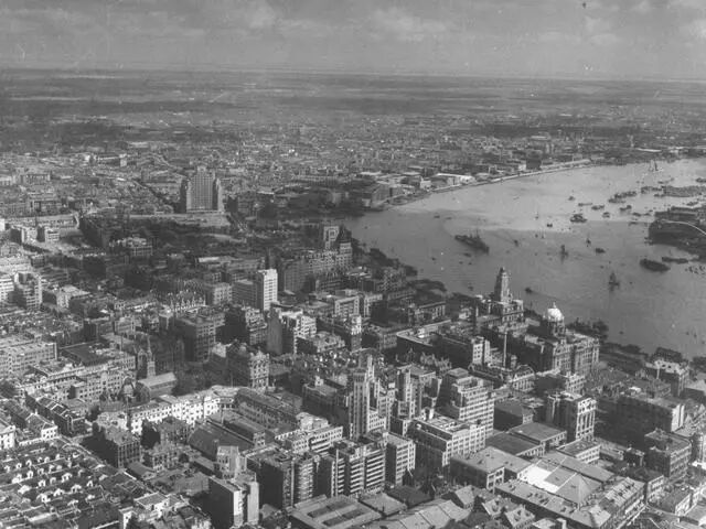 1945年12月,上海上空美国舰队的鸟瞰图。