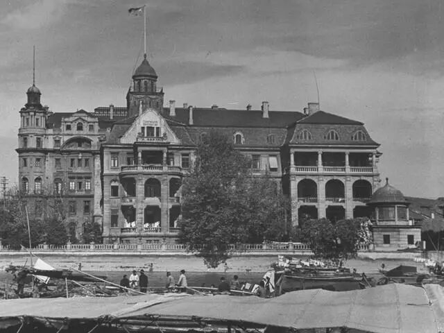 1945年12月的上海外滩。外滩是上海的一条主要街道,两旁是银行、酒店和其他大型建筑。