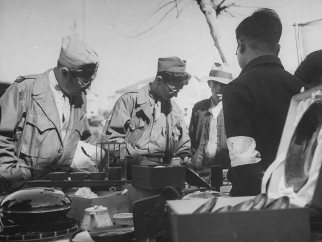 1945年12月,上海的人们在露天集市购物,日本商人在被遣返前出售他们的救援物品。