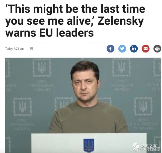 2022年2月24日,俄乌开战,由于双方军事实力悬殊,开战之初,乌克兰总统泽连斯基用几近绝望的语气,要求跟普京通话;向世界求救,一圈碰壁后,2月25日,乌克兰总统泽连斯基在视频电话会表示:“这或许是你们最后一次看到我活着!”