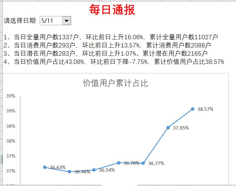 如此对价值用户占比生成图表,图表便可随下拉控件框日期选择的不同进行前7日数据的变化了。如下动态图所示: