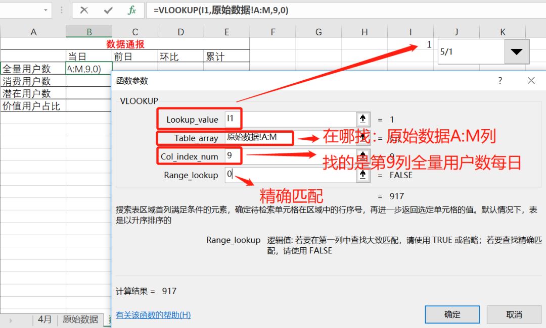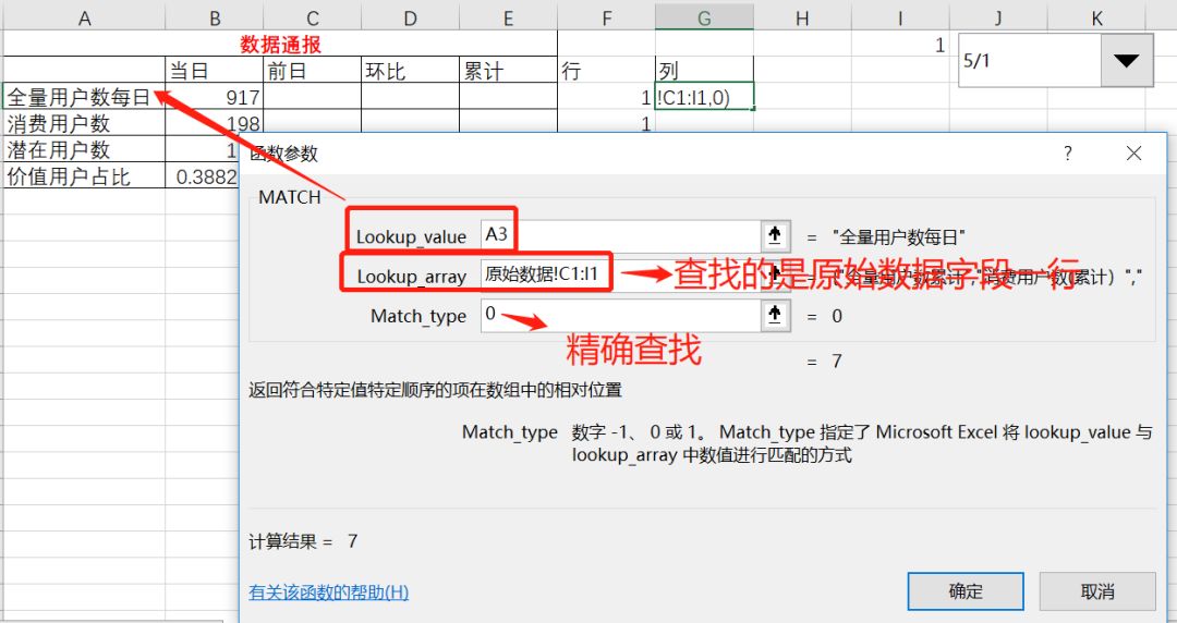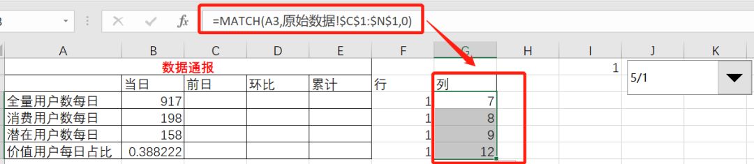 =MATCH(A3,原始数据!C1:I1,0),要找的是A3单元格全量用户数每日这个字段在原始数据表字段行中是第几个。加上绝对引用下拉公式出来了列的坐标。