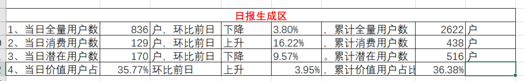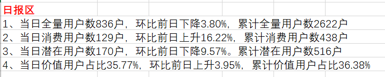 事情是这样的,小明每天都要进行日报通报,统计每天的全量用户数、消费用户数以及潜在用户数,算出价值用户数占比,且每个数都要与前一日对比,输出一大串文字并生成图片。每天的内容都是一样的,只是数字不一样,之前小明是每天都算出这些数字,然后再从日报中更改相应的部分,这样的工作重复个一两年也是会把人的精气神熬没了的呀。小明问我为什么他学了那么多公式,却依旧用不好Excel?