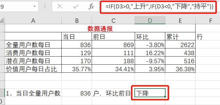 在日报生成区输入生成日报的字符串,其中通过环比来判断上升下降的,应用if嵌套条件判断。=IF(D3>0,"上升",IF(D3<0,"下降","持平"))