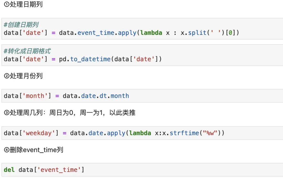 原数据中,日期(event_time)格式为精确到秒的时间格式,为了方便后续分析,需要将时间处理成日期列、月份、周几的形式:
