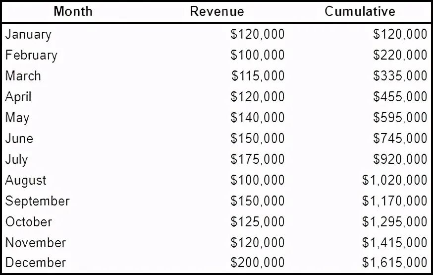 , SUM(Revenue) OVER (ORDER BY Month) AS Cumulative