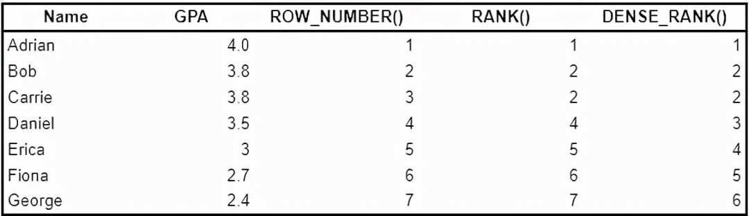 Rank()返回从1开始的每行的唯一编号,除了有关系时,等级()将分配相同的数字。同样,差距将遵循重复的等级。
