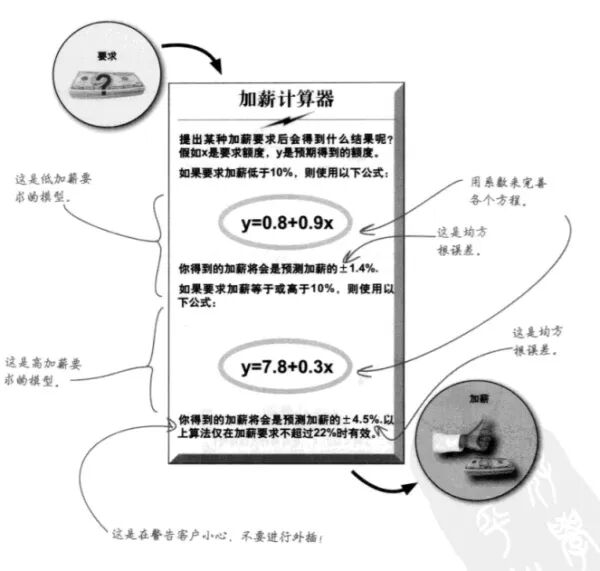 后面几章开始讲解直方图的制作、通过回归分析法预测某些结果值、指出预测的误差范围以及关系型数据库的基本概念。其中一个预测加薪幅度的例子简明扼要地讲解了相关性、散点图、回归线、外插法、残差、回归线的均方根误差等概念,最后做出了一个比较完美的加薪模型。