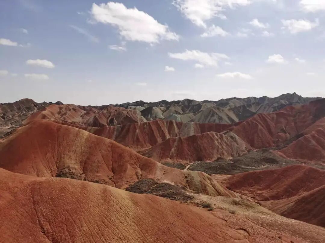 由于我们网上攻略的是张掖的七彩丹霞要傍晚去看才好看,于是早上我们就先到了大佛寺参观,殿内塑释迦牟尼涅槃像,为全国最大的室内泥塑卧佛,身长34.5米,肩宽7.5米。后来实在等不到晚上去七彩丹霞了,于是吃完午饭就去了七彩丹霞景区,后来才知道,其实有阳光的时候去就行了,有阳光一照,整个地貌太美了。七彩丹霞其实就是一群山沟,为什么叫这个名字呢,主要是因为该地区的地貌为丹霞地貌,也就是由色彩斑斓而称奇,有红色、黄色、白色、绿蓝色,色调有顺山势起伏的波浪状,在阳光的照射下,像披上了一层红色的轻纱,熠熠泛光,色彩异常艳丽,让人惊叹不已,网友称其为五花肉,哈哈哈,你们看是不是。这是原图,小红书上看到的那种更加饱满颜色丰富的大都是后期调过色的,照片和现场又不一样,放一段当时拍的小视频吧。