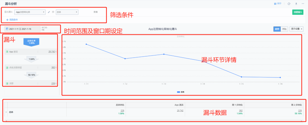 上面针对各个主要模块,进行了标注,就不详细展开了。总体来讲,产品设计的是比较合理的,用户既可以看到漏斗情况,又可以针对每个漏斗环节进行详细分析。