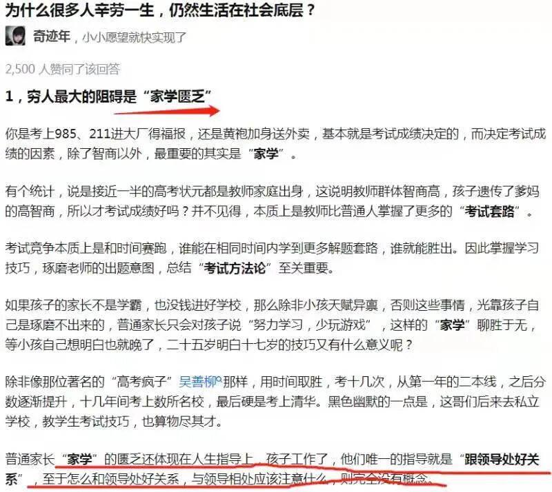 在知乎上看到一个问题:为什么很多人辛劳一生,仍然生活在社会底层。里面有一个回答的其中一条说到,家学的匮乏是最大的阻碍,这让我想了很久。