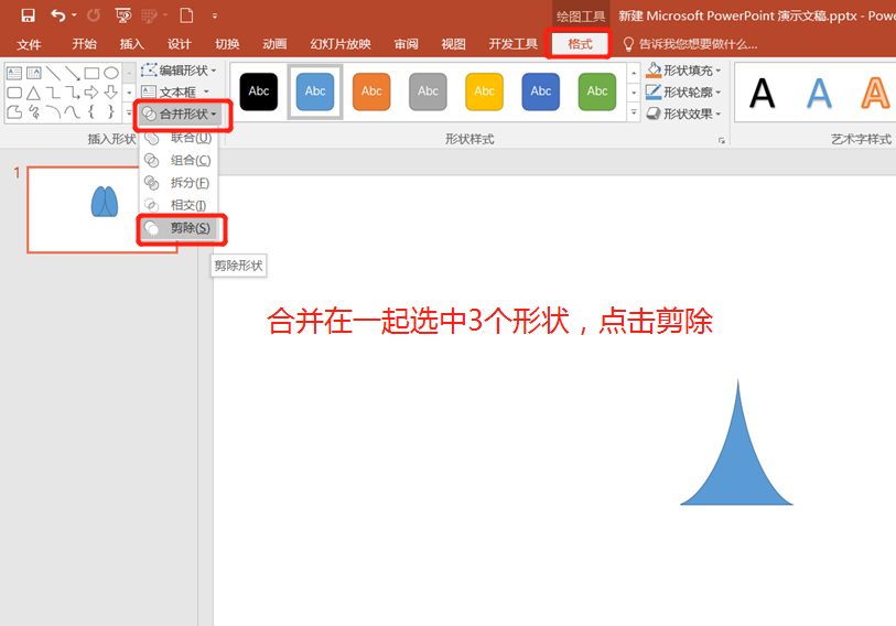 把这3个形状挪到一起,全部选中后点击【格式】——【合并形状】——【剪除】,就得到了我们想要的这个形状了。