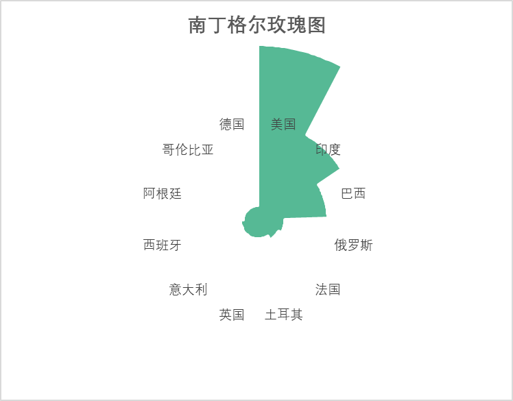 饼图是用角度的大小体现数值或占比,南丁格尔玫瑰图是用扇形的半径表示数据的大小,各扇形的角度则保持一致。可以说南丁格尔玫瑰图实际上是一种极坐标化的圆形直方图。它夸大了数据之间差异的视觉效果,适合展示数据原本差异小的数据。