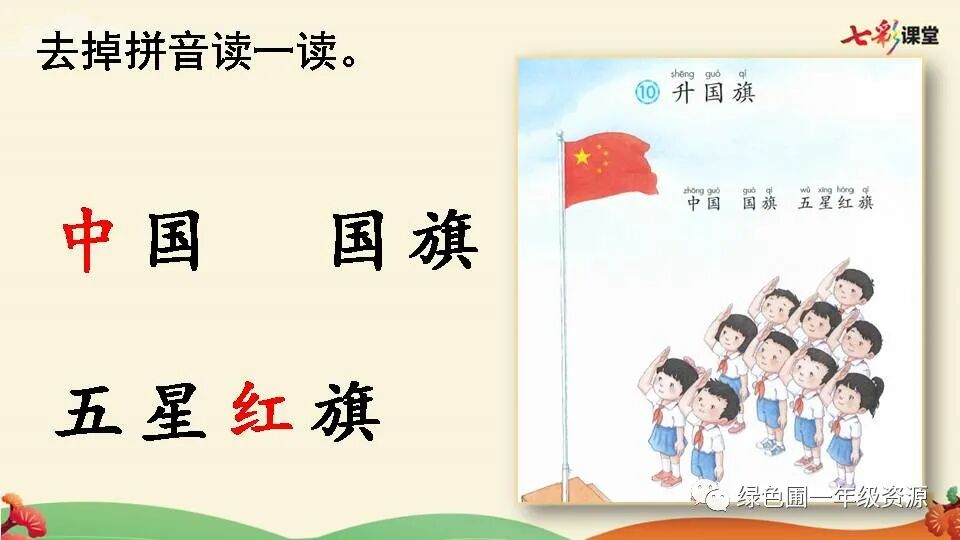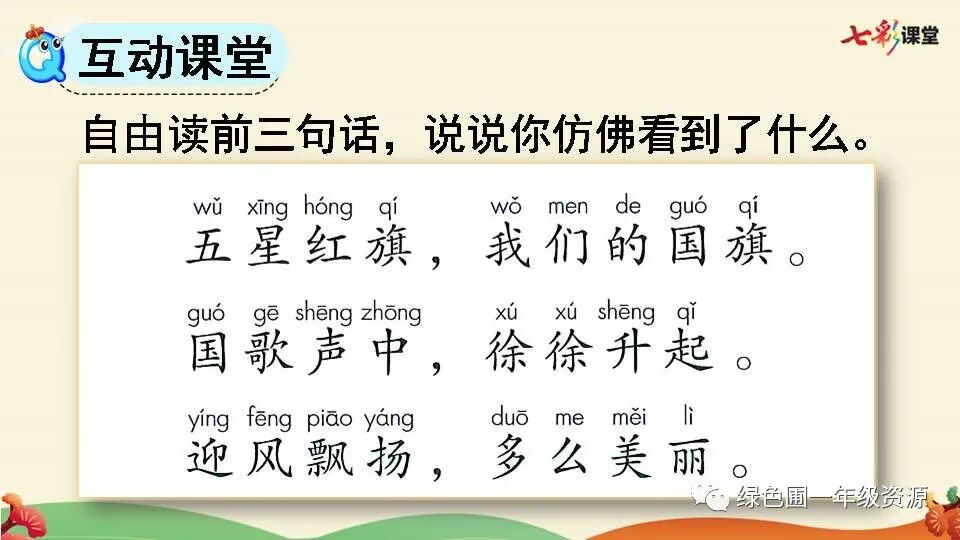 这篇课文让学生认识五星红旗是我们的国旗,以及升国旗时学生应该怎样做,激发学生热爱祖国的思想感情。课文要求学生有热情地朗读,背诵课文及学会本课生字、词,并且美观地书写。通过这一单元的学习,复习和巩固了所学的拼音,也为今后的课文朗诵打下扎实的基础。全篇课文共有三句话,第一句写五星红旗是我们的国旗;第二句写国旗升起的情景;第三句写升国旗时我们怎样做。整篇课文文字简洁明了,字里行间表达了对国旗的热爱之情。