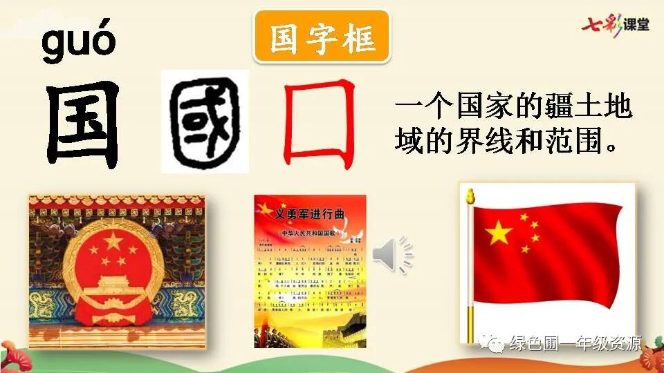 国歌:由国家正式规定的代表本国的歌曲。中国以《义勇军进行曲》为国歌。