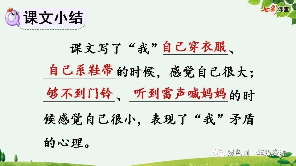 课文通过 3 个“有时候”和“更多的时候”把文章紧密地串联起来,形成一个有机整体。第二自然段的“大”,第四自然段的“小”,就是这种矛盾的具体体现。本文通过描述孩子认为自己长大了能做的事和认为自己小的具体事例,告诉我们长大了就要做到自己的事情自己做,多帮助他人做事。
