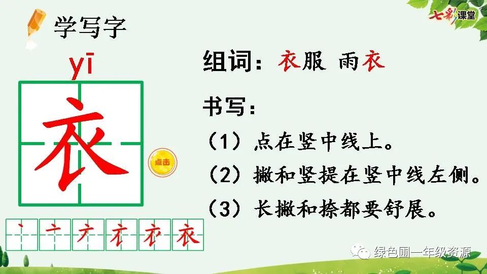 衣yī(衣服、上衣、雨衣)