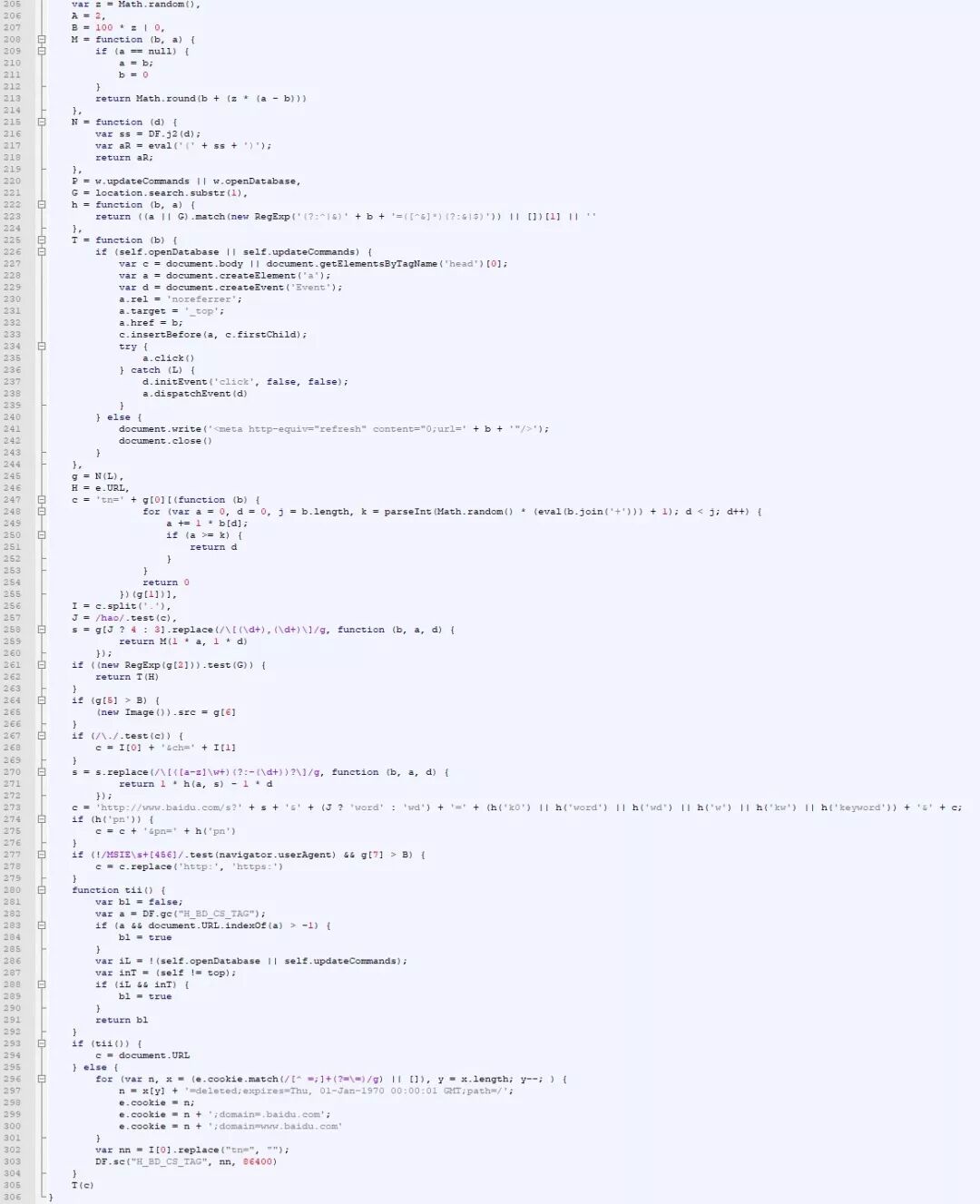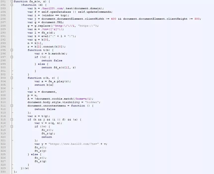 如上图,劫持Hao123所示用的HTTP数据在0021.dat中存放,解密后与0025.dat大致相同,但该文件中只存放又针对Hao123的相关劫持代码。劫持函数,如下图所示: