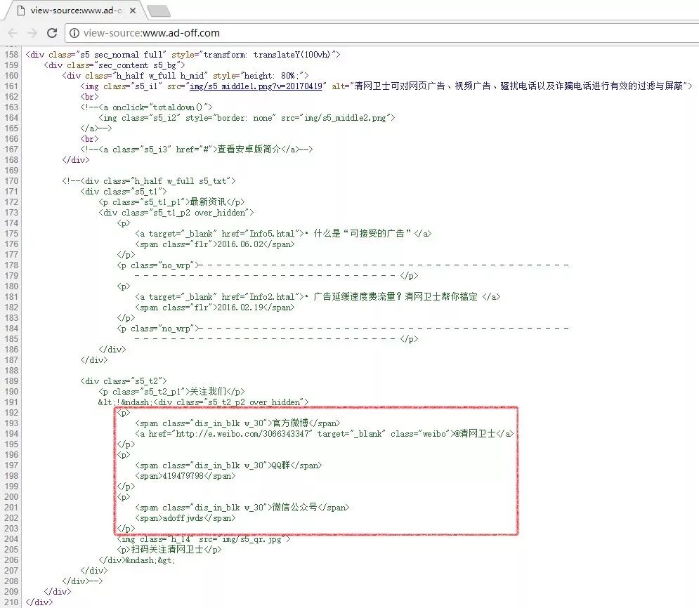 值得一提的是,在我们查看清网卫士页面源码的时候,发现在被注释的网页代码中竟然出现了ADSafe(ADSafe)的官网微博地址和用户QQ群。如下图所示: