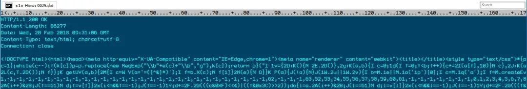 如上图所示,劫持规则每条含义大致相同。首先通过正则匹配网址,在网址匹配成功之后,会将“$$”后的HTTP数据包内容进行返回,在返回的数据包中包含带有流量劫持功能的JavaScript脚本。以0025.dat解密后数据包内容为例,如下图所示: