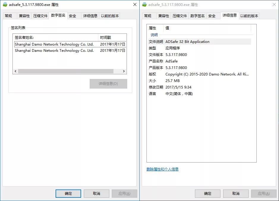 该版本ADSafe安装包数字签名有效,名称为“Shanghai Damo Network Technology Co. Ltd.“,即上海大摩网络科技有限公司。如下图所示: