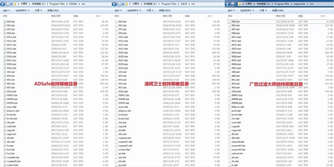 广告过滤大师劫持策略目录与ADSafe、清网卫士对比,如下图所示: